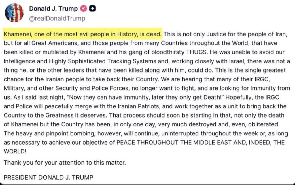 राष्ट्रपति ट्रंप ने अपने सोशल मीडिया प्लेटफॉर्म Truth Social पर दावा किया कि ईरान के सुप्रीम लीडर अली खामेनेई “मारे गए हैं” और इसे ईरानी जनता के लिए “देश पर दोबारा नियंत्रण पाने का सबसे बड़ा मौका” बताया। उन्होंने संकेत दिया कि सैन्य कार्रवाई जारी रहेगी।