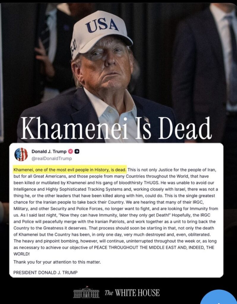 рдЕрдореЗрд░рд┐рдХреА рд░рд╛рд╖реНрдЯреНрд░рдкрддрд┐ рдбреЛрдирд╛рд▓реНрдб рдЬреЗ. рдЯреНрд░рдВрдк рдиреЗ рдПрдХ рдмрдбрд╝рд╛ рдФрд░ рд╡рд┐рд╡рд╛рджрд┐рдд рдмрдпрд╛рди рджреЗрддреЗ рд╣реБрдП рджрд╛рд╡рд╛ рдХрд┐рдпрд╛ рд╣реИ рдХрд┐ рдИрд░рд╛рди рдХреЗ рд╕рд░реНрд╡реЛрдЪреНрдЪ рдиреЗрддрд╛ рдЕрд▓реА рдЦрд╛рдордиреЗрдИ тАЬрдорд░ рдЪреБрдХреЗ рд╣реИрдВтАЭред рдЯреНрд░рдВрдк рдиреЗ рдЗрд╕реЗ тАЬрдиреНрдпрд╛рдптАЭ рдХрд░рд╛рд░ рджреЗрддреЗ рд╣реБрдП рдХрд╣рд╛ рдХрд┐ рдпрд╣ рди рдХреЗрд╡рд▓ рдИрд░рд╛рди рдХреЗ рд▓реЛрдЧреЛрдВ рдХреЗ рд▓рд┐рдП рдмрд▓реНрдХрд┐ рдЙрди рдЕрдореЗрд░рд┐рдХрд┐рдпреЛрдВ рдФрд░ рдЕрдиреНрдп рджреЗрд╢реЛрдВ рдХреЗ рдирд╛рдЧрд░рд┐рдХреЛрдВ рдХреЗ рд▓рд┐рдП рднреА рдиреНрдпрд╛рдп рд╣реИ, рдЬрд┐рдиреНрд╣реЗрдВ рдЙрдиреНрд╣реЛрдВрдиреЗ рдХрдерд┐рдд рд░реВрдк рд╕реЗ рдиреБрдХрд╕рд╛рди рдкрд╣реБрдВрдЪрд╛рдпрд╛ред